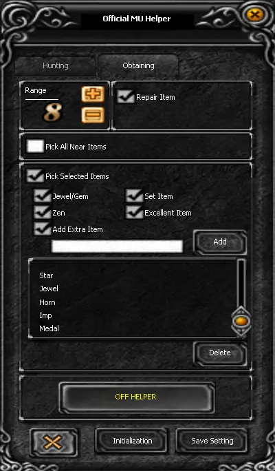 This window shows the Obtaining settings of the Official MU Helper, which control item pickup and item-related automation during hunting. Range
